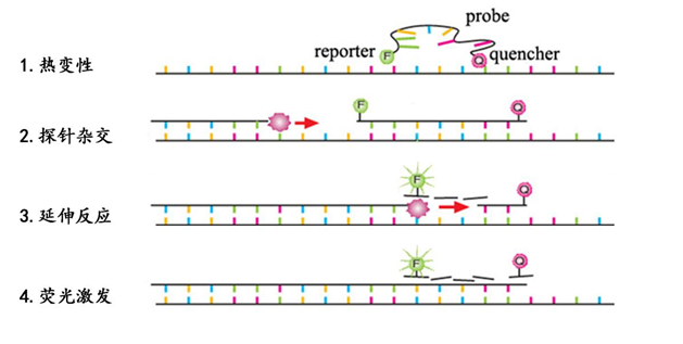 Taqman探針法:5末端連接熒光基團(tuán),3端末端連接猝滅基團(tuán),PCR擴(kuò)增時(shí),兩個(gè)基團(tuán)相互分離,熒光基團(tuán)得以檢測(cè)。