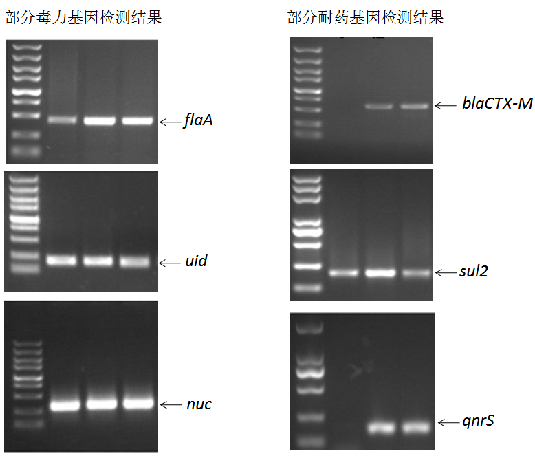 (2)本公司擁有多種測序過的ATCC菌株的毒力基因及耐藥基因基因組DNA標(biāo)準(zhǔn)品,能夠?qū)崿F(xiàn)對(duì)毒力基因以及耐藥基因的特異性分子檢測。